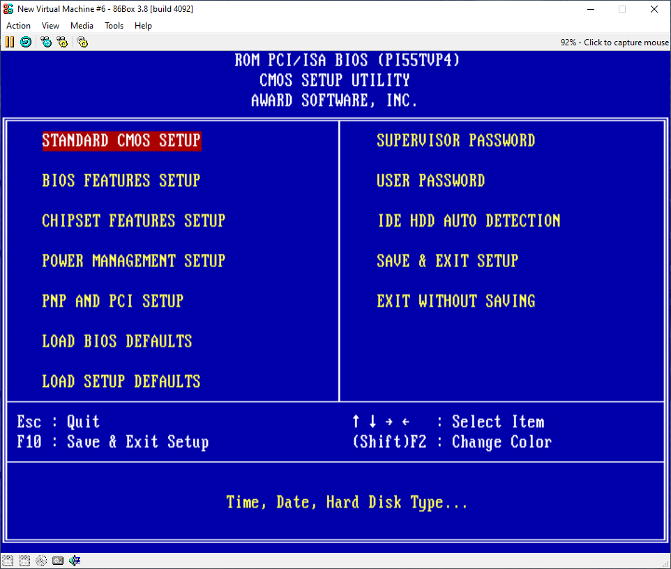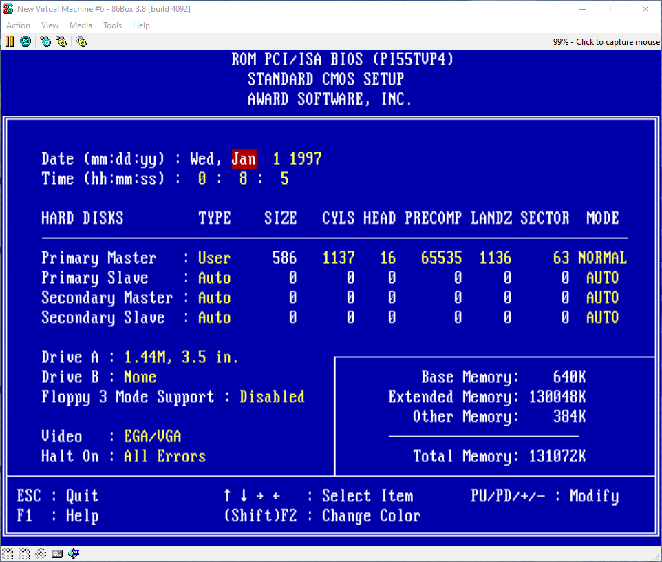 We need to fix the BIOS so restart the emulated machine by going to a little icon at the top of the emulator that looks like a blue arrow going in a circle next to the pause button and click it. You will be asked if you want to hard reset the emulated machine, just press reset and it should restart.