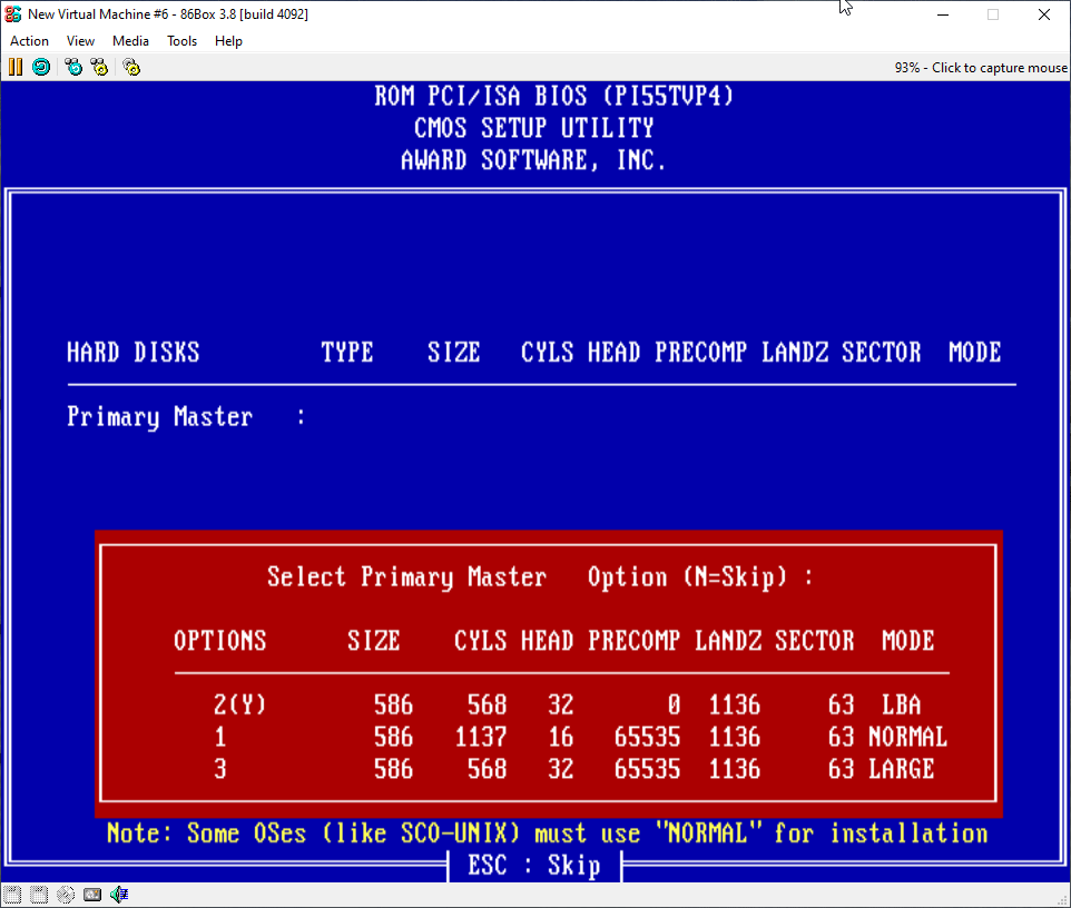 Press 1 which will select the “normal” mode then press enter. The screen will now show some things, and this should be what you selected before. For the others, just press esc as it is set to no by default. You will be now out of the hard disk setup screen and back to the BIOS as before.