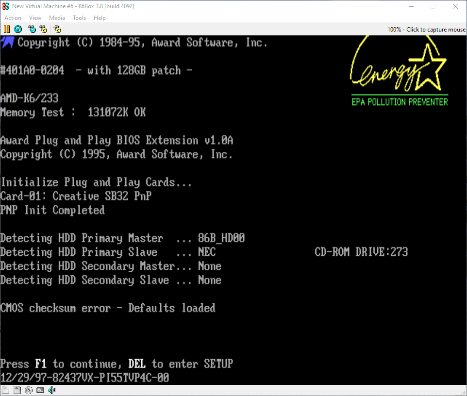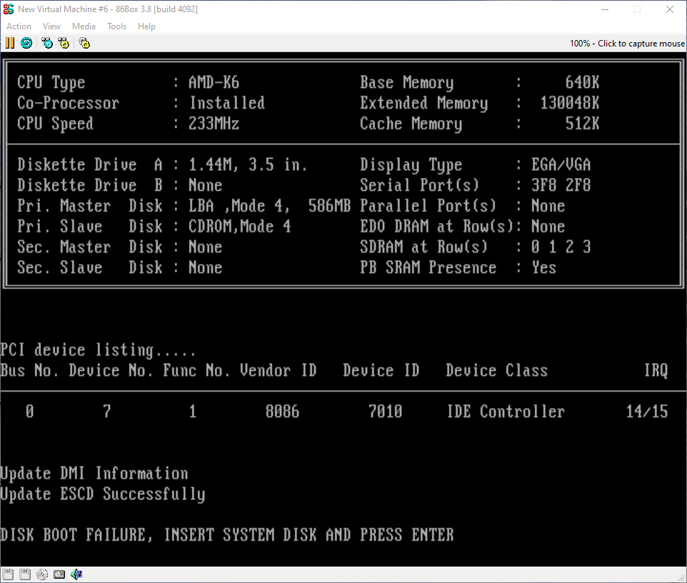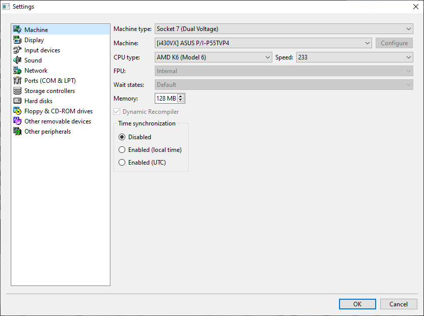 Along with this, you should have as your machine set as the Asus P/-PI65UP5 (C-P55T2D). For the CPU model set it to AMD K6 (Model 6) with the speed set to 233.