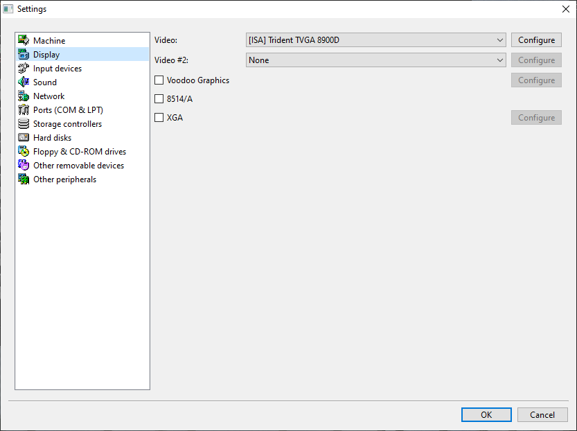 The video card we will use for this emulation is the Trident TVGA 8900D. The other settings such as XGA are not required.