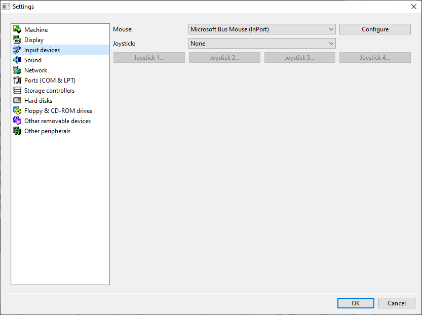 For the input device, aka the mouse, use the Microsoft Bus Mouse (InPort) as it isn't broken as the others.
