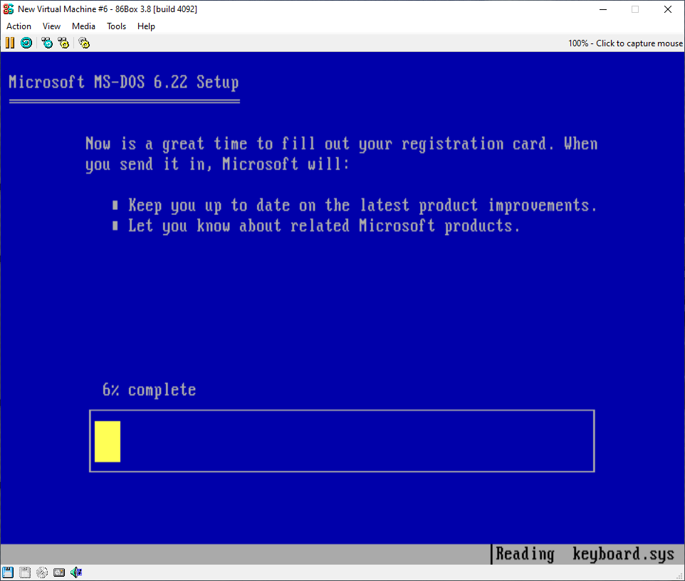 The emulator screen will go black for a moment before showing “Starting MS-DOS” and then going to the beginning of the installation.