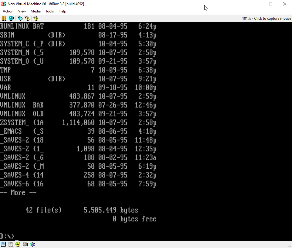 Type D:, press enter to access the driver where the CD-ROM is and type “dir | more” to see the contents of the floppy. I would recommend having something like notepad open as we will need to take note of two files on the CD-ROM. The two files you will need remember are “BOOTFLOP.3IN” and “RAWRITE.EXE”. If you are curious, BOOTFLOP.3IN is basically just the boot floppy image for 3.5” floppies and RAWRITE is the program we will use to write BOOTFLOP.3IN to the floppy. Press enter until you are back at the D:\> prompt.