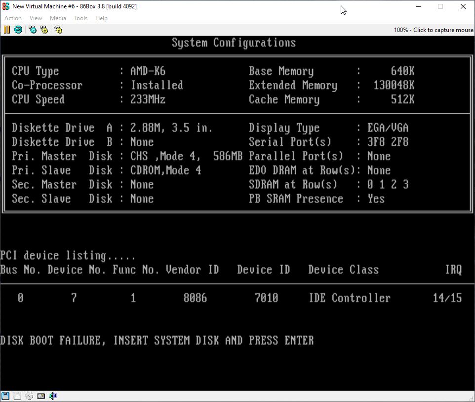 If you let the machine boot for the first time by continuing with pressing f1, you may notice a screen that says “DISK BOOT FAILURE, INSERT SYSTEM DISK AND PRESS ENTER” along with some other info: